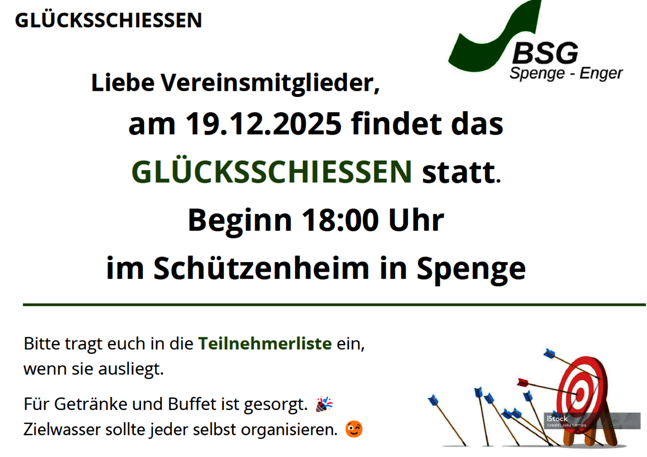 Mitglieder sind herzlich eingeladen am Tagesausflug (vergünstigt) teilzunehmen oder zur Weihnachtsfeier mit guter Laune beizutragen. Vielleicht räumst du auch beim Glücksschießen erfolgreich ab. Ein kleiner Beitrag für dich - bedeutet Unterstützung für den Verein.